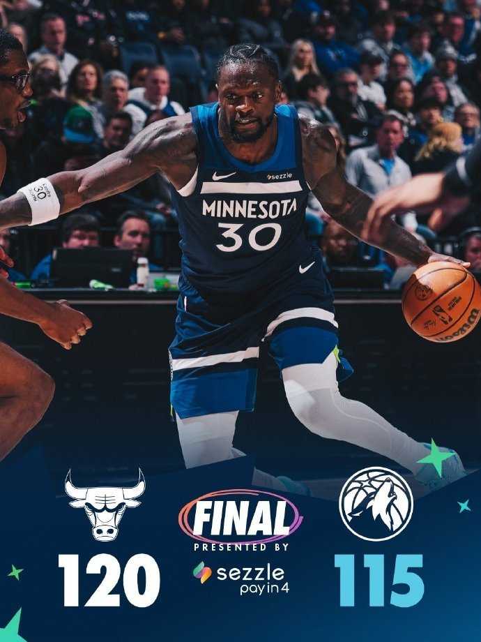 在惨遭3连败,掉到附加赛区之后,森林狼今天又在主场以115-120不敌公牛,吞下4连败,战绩变成27胜18负,继续排在西部第七,无缘重回前六。公牛最近状态不错,取得4胜1负的战绩,胜率重回50%,目前以22胜22负继续排在东部第九。